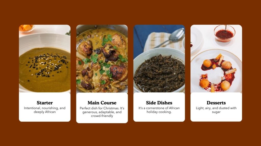 This is the kind of Christmas meal that unfolds slowly. A warm starter to welcome everyone in. A comforting main dish that feels familiar yet special. Vegetable sides that ground the meal, starches that satisfy, and desserts that feel joyful without being overdone. Every recipe on this menu—whether from The Blue Fufu or other beloved African food bloggers—has a place and a purpose.